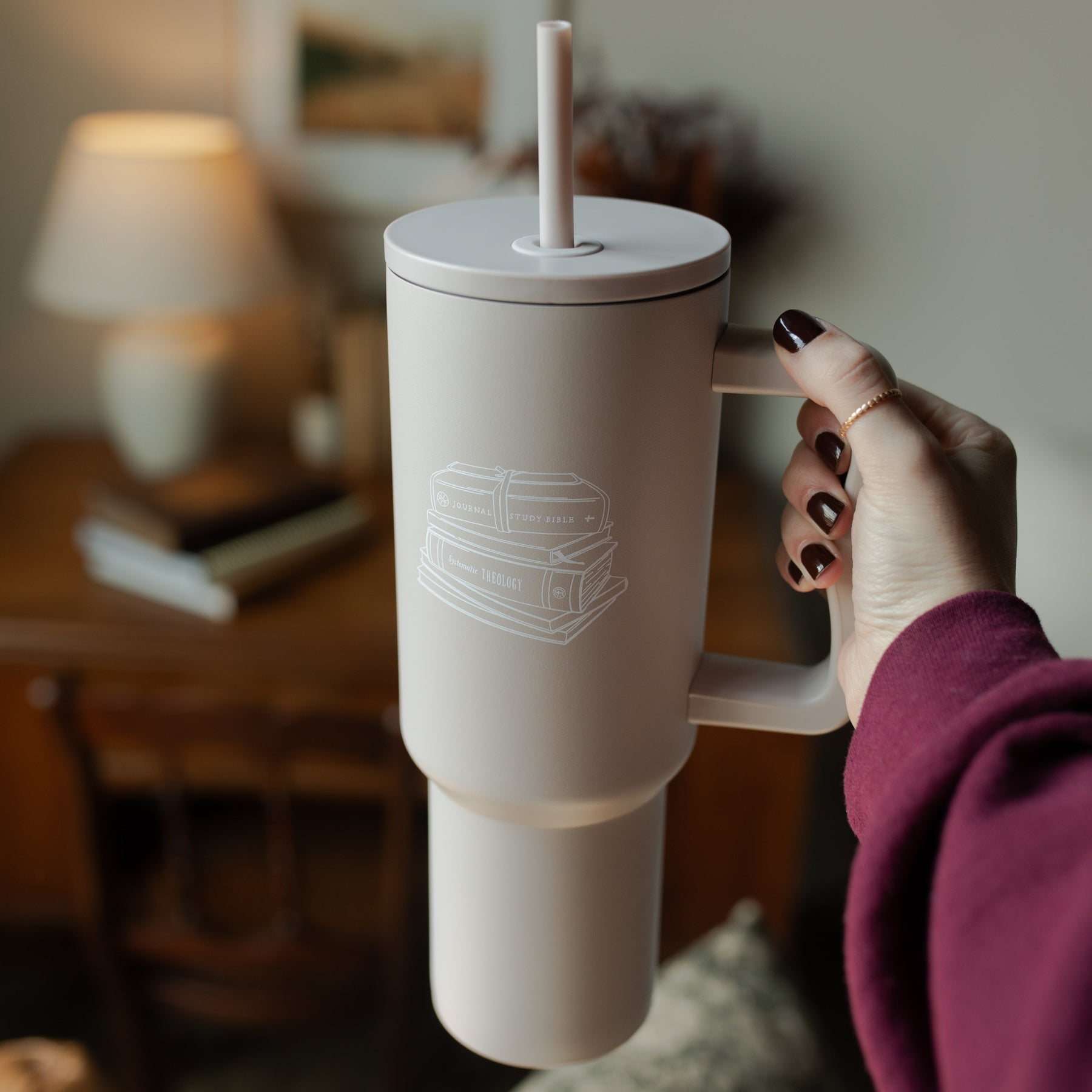 A woman holding A taupe tumbler with an image of stacked books on it