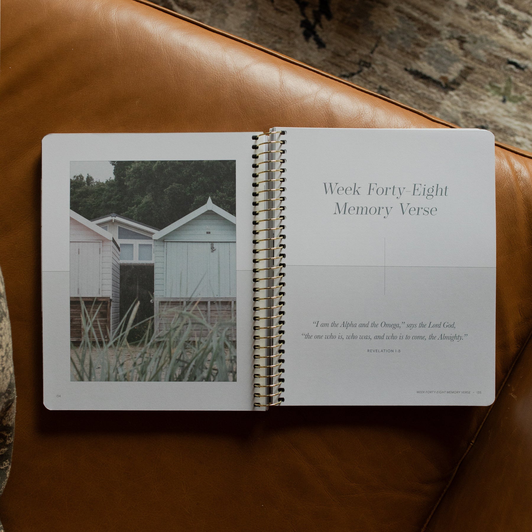 Each week contains five days of study material, including daily study questions, weekly Scripture memory verses, and reflection questions.