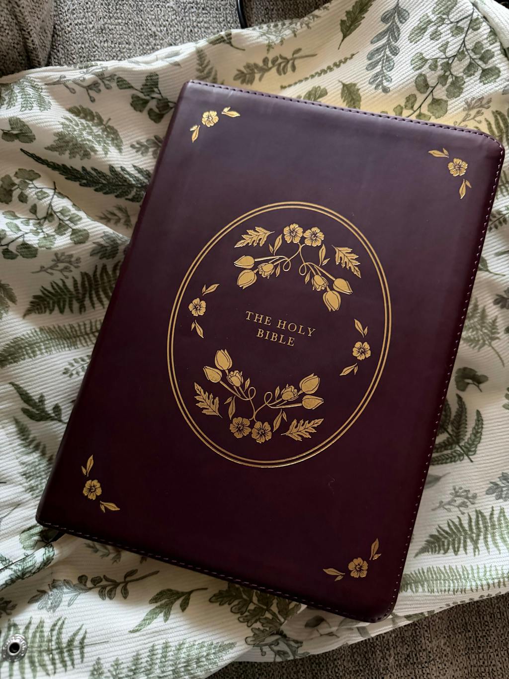 leather bible with gold etching cover on a textured blanket