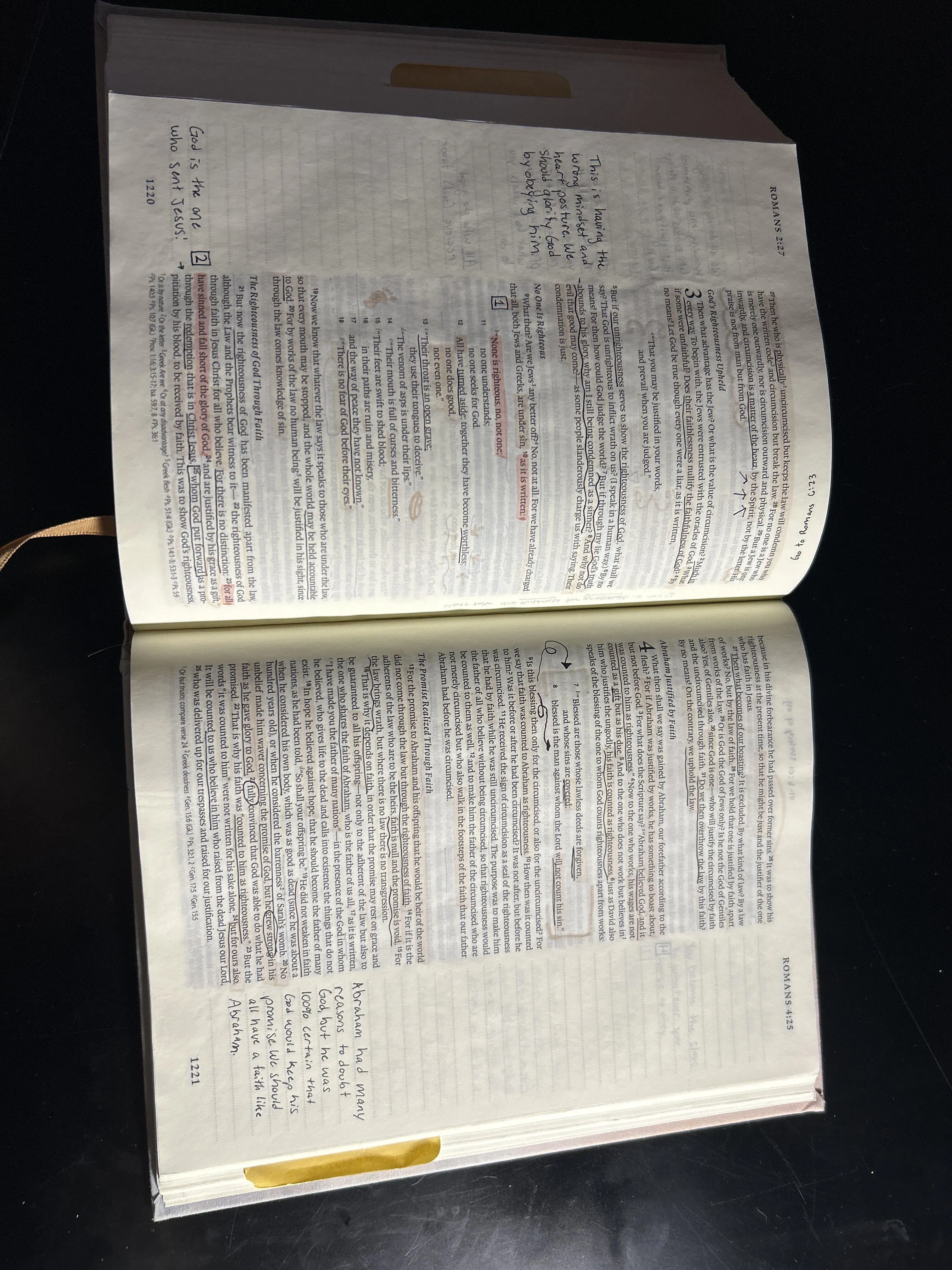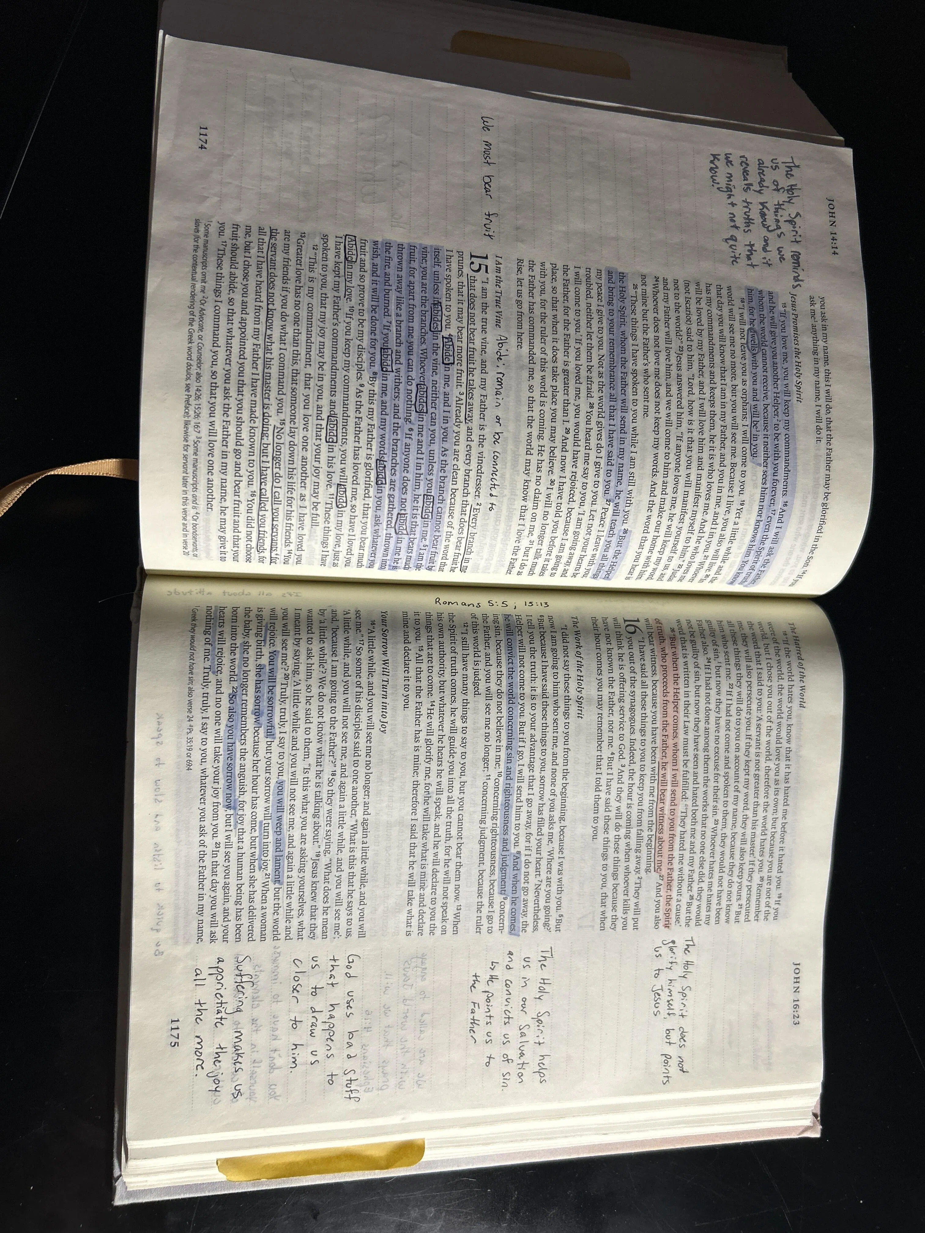 Bible opened with a highlighter resting in the middle on an opened bible study
