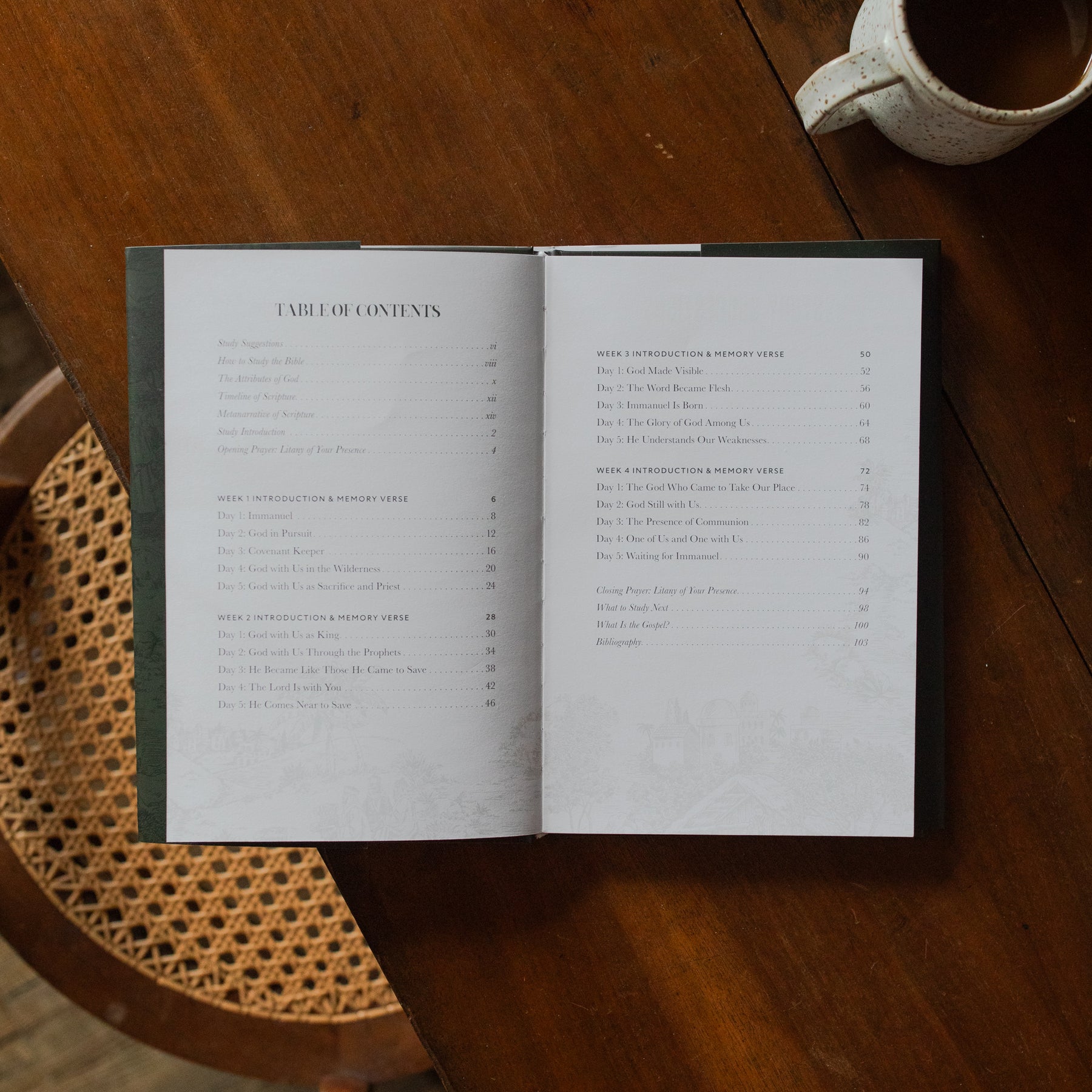 Each week contains five days of study content, including memory verses, reflection questions, prayer, and journaling.