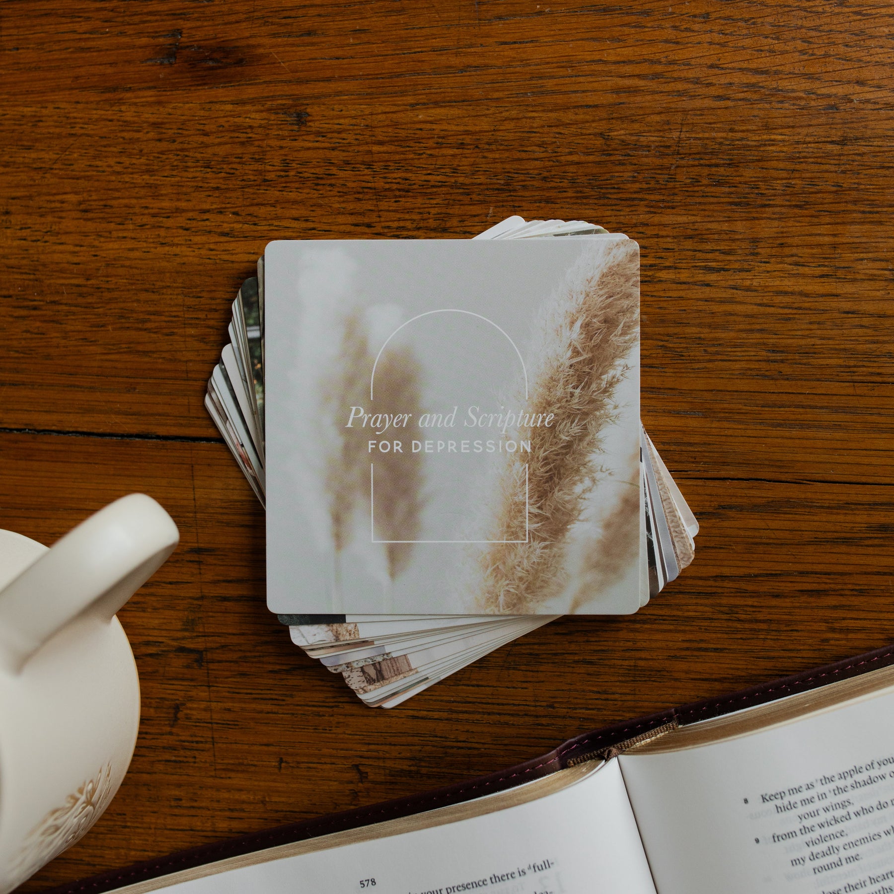 2 stacks of the Verse Cards for Depression facing the prayers on a wooden table next to a coffee cup